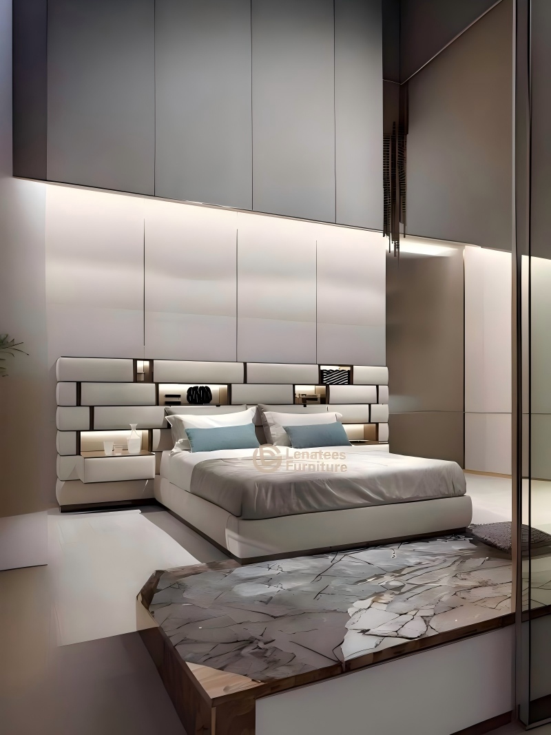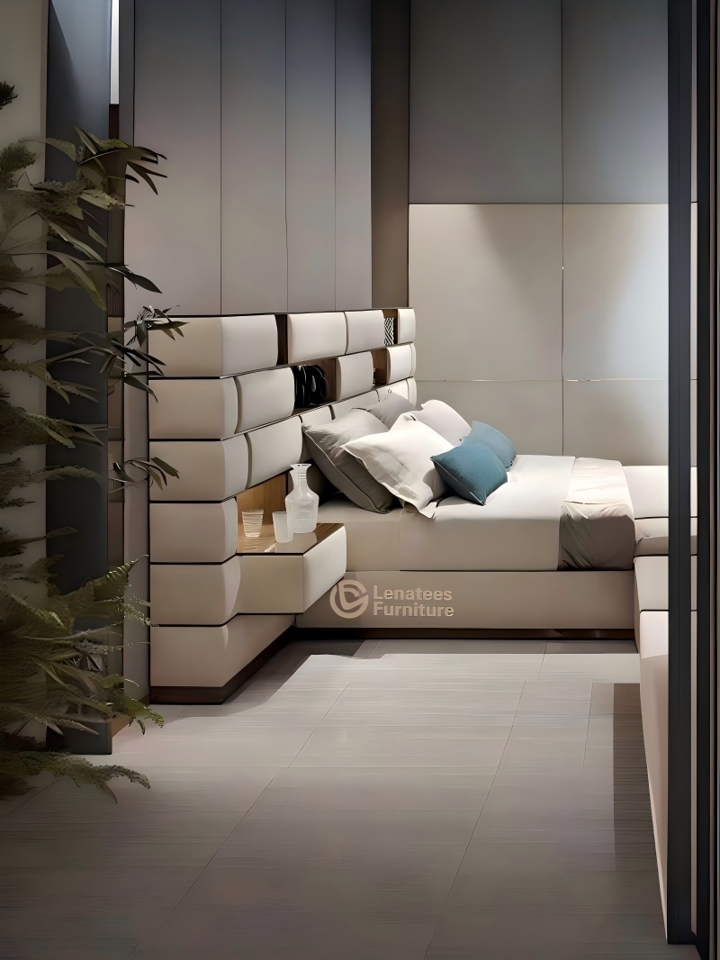 Den här lyxsängen har en djärv sänggavel med raffinerade metallaccenter – som blandar komfort, hantverk och modern design.